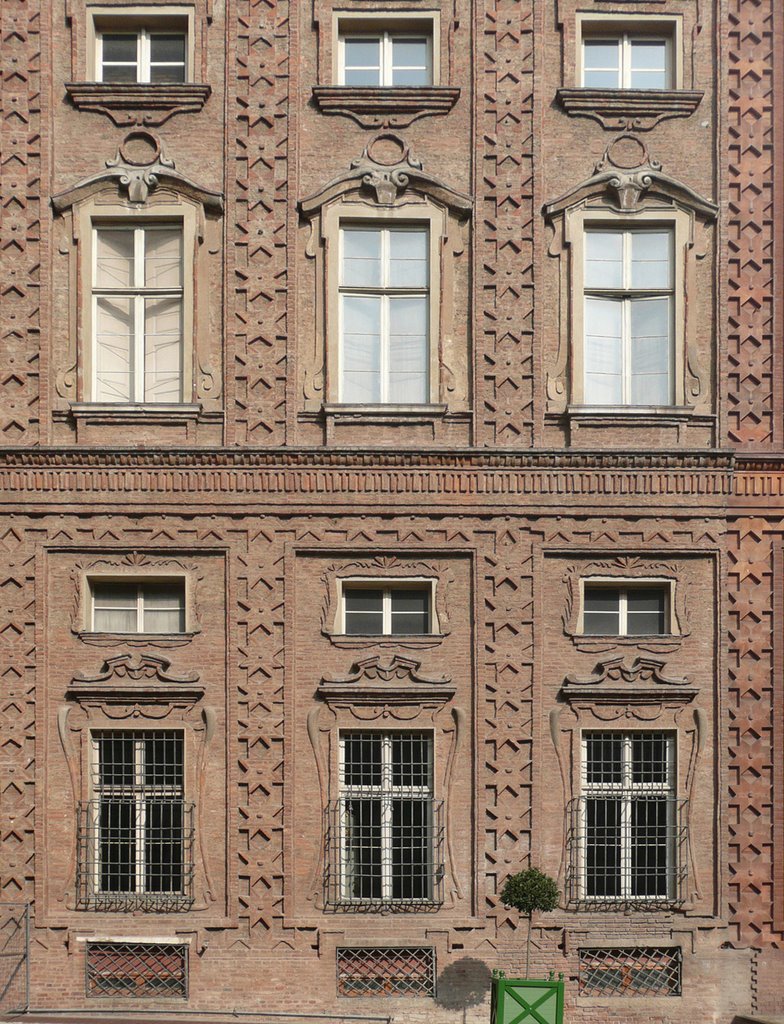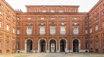 A fachada principal, a fachada noroeste (figura 39.11), de frente para a Praça Carignano (a de baixo, na figura 39.9) e as fachadas do pátio, o "cortile", são de Guarini.